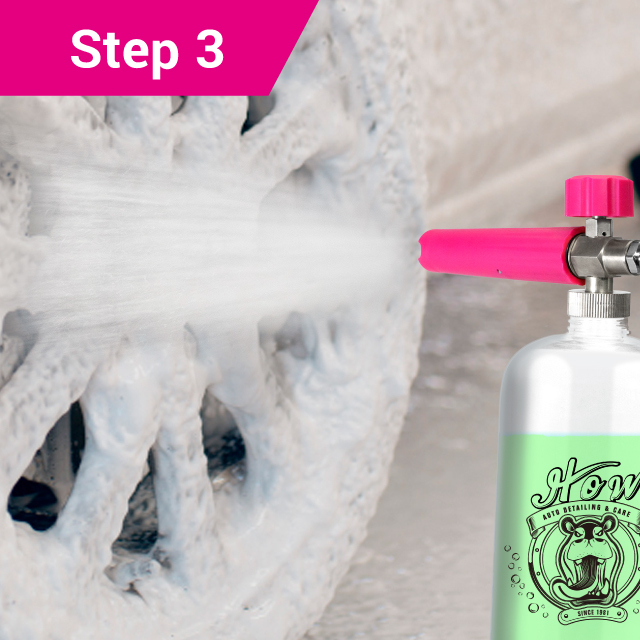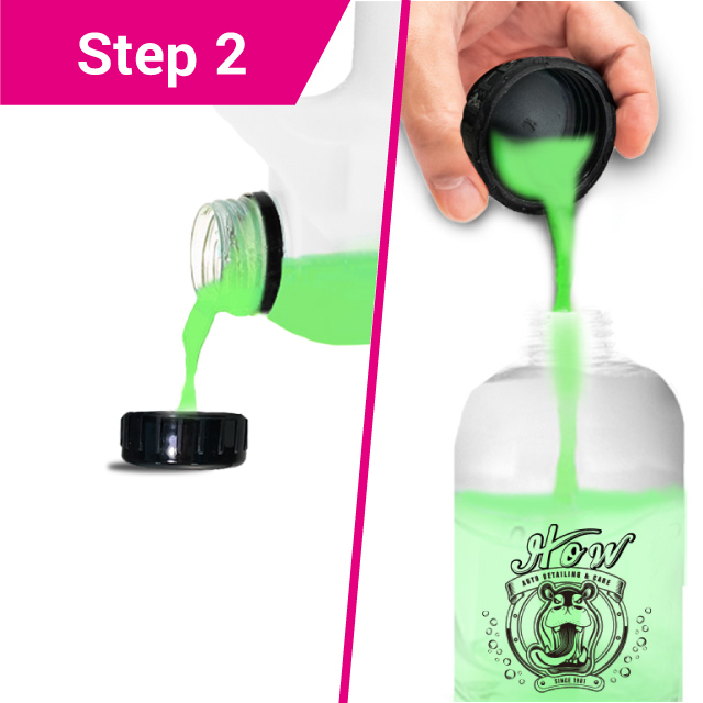 Add 1 bottle cap of H.O.W SHINE SERIES SNOW FOAM CAR WASH SOAP to H.O.W Snow Foam Cannon.